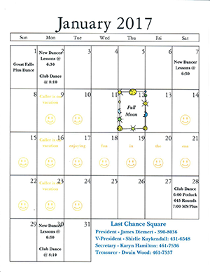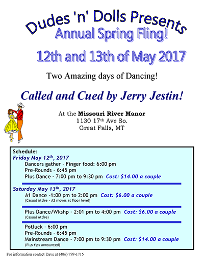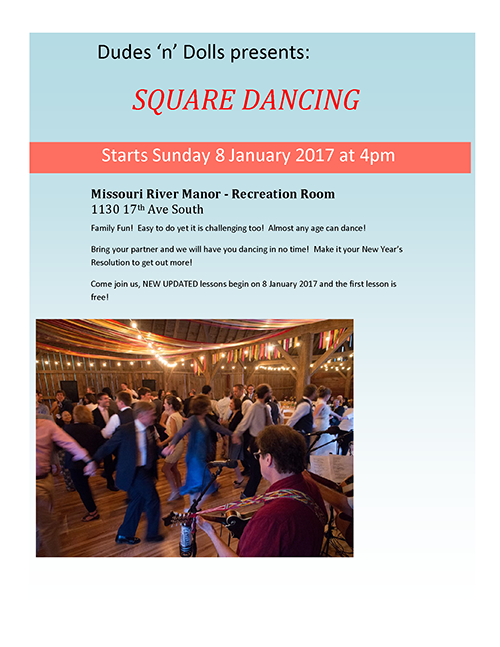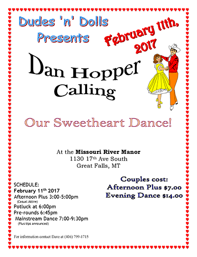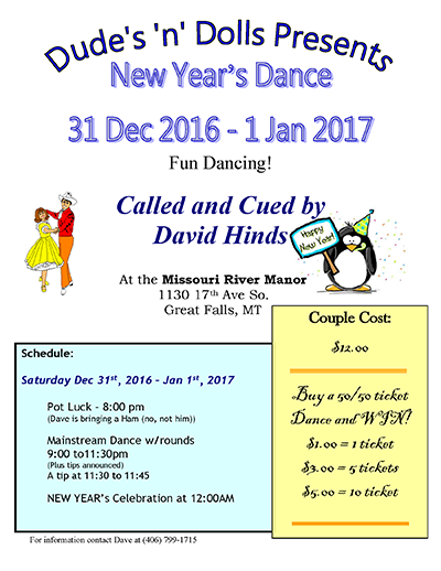 We are now dancing three times a month on Saturdays leaving at least one Saturday open for travel. We've scheduled the 2nd, 3rd and 4th Saturday of the month and dance at the Missouri River Manor at 1130 17th Ave S., Great Falls, MT. On the 3rd Saturday it is pure Plus Dance starting at 7pm. Check out our calendar for dances! We begin at 6pm for fellowship and finger foods on the 2nd and 4th Saturday's, Pre-rounds at 6:45 ish pm with Squares starting at 7:00 pm. Dances end at 9:30 pm. MS with Plus tips announced. David Hinds is the Club Caller and Cuer. Come out and join in the fun..